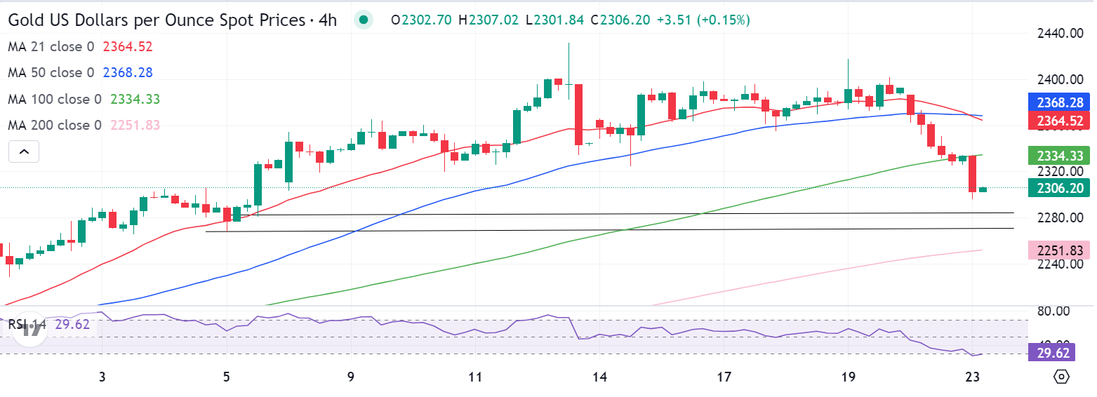 掷售延长至100周期挪动均线美元/盎司下方,并一度跌破2300美元/盎司。