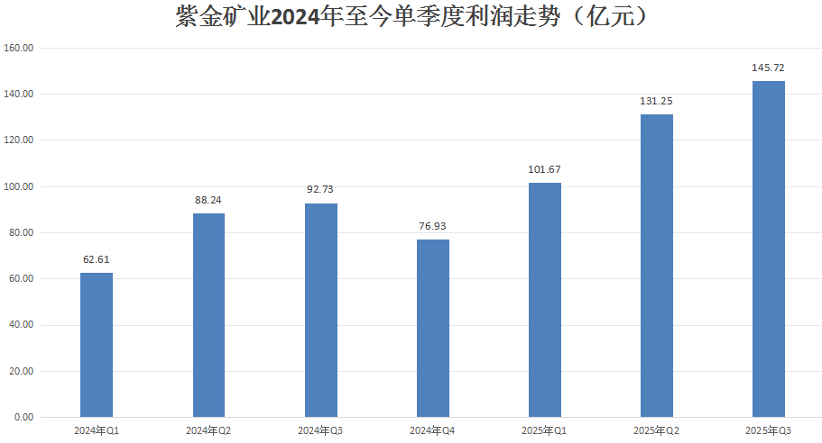 遵循三季报,1-9月,公司金锭、金精矿发售价钱划分抵达746.43元/克和685.21元/克,个中金精矿毛利率依然抵达72.8%,较上年同期伸长近5个百分点。 “讲述期,公司矿产金产量同比和环比赓续擢升,进步终年打算目标时序进度,重要增量来自:新并购的加纳阿基姆金矿(交割后5个月奉献产量3.2吨)、新投产的新疆萨瓦亚尔顿金矿,以及管制量擢升的山西义兴寨金矿、贵州水银洞金矿、塞尔维亚博尔铜金矿。”紫金矿业三季报指出。 2025年1-9月,公司矿产金产量65吨,同比添补20%,金锭、金精矿等产物销量也有分别水准的伸长。 半年报显示,上半年紫金矿业黄金营业奉献的毛利,占集团毛利的38.6%,进步同期公司铜营业的毛利占比。另据前述卖方测算,前三季度矿产金占集团毛利比例依然擢升至40.4%。 叠加公司矿产铜营业的端庄伸长,公司同期归母净利润进一步添补至378.6亿元。 个中,第三季度145.72亿元的归母净利润,竣工同比、环比伸长的同时,再次改革公司单季度盈余记录。