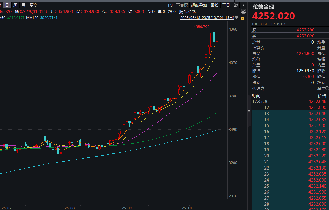 Wind数据显示,从10月19日算起,依然有西部证券等三家卖方安排公司终年盈余预期,所给出的利润预期值均为514亿元掌握,较8月末披露半年报时的利润预期值遍及上调50亿元掌握。 一年500亿元的净利润是什么观念?手腕略,中邦石化客岁净利润为503亿元,蕴涵几大邦有银行正在内这一利润程度能够排到总共A股的第18名,目前卖方给出的中邦石化2025年盈余预期值至众也只是510亿元。 由此也能够看出,本年紫金矿业盈余才略之强横,只是因为四时度仍有两个众月光阴,本年紫金矿业盈余能否一举打破500亿元仍存不少变量。 站正在史籍高位,接下来邦际金价、铜价何如运转,是掌握紫金矿业四时度功绩走势的最重要变量之一。 个中,伦敦金现货正在三季度上涨16%的根基上,10月17日再次冲高至4380美元/盎司,短期墟市震撼危急随之擢升。