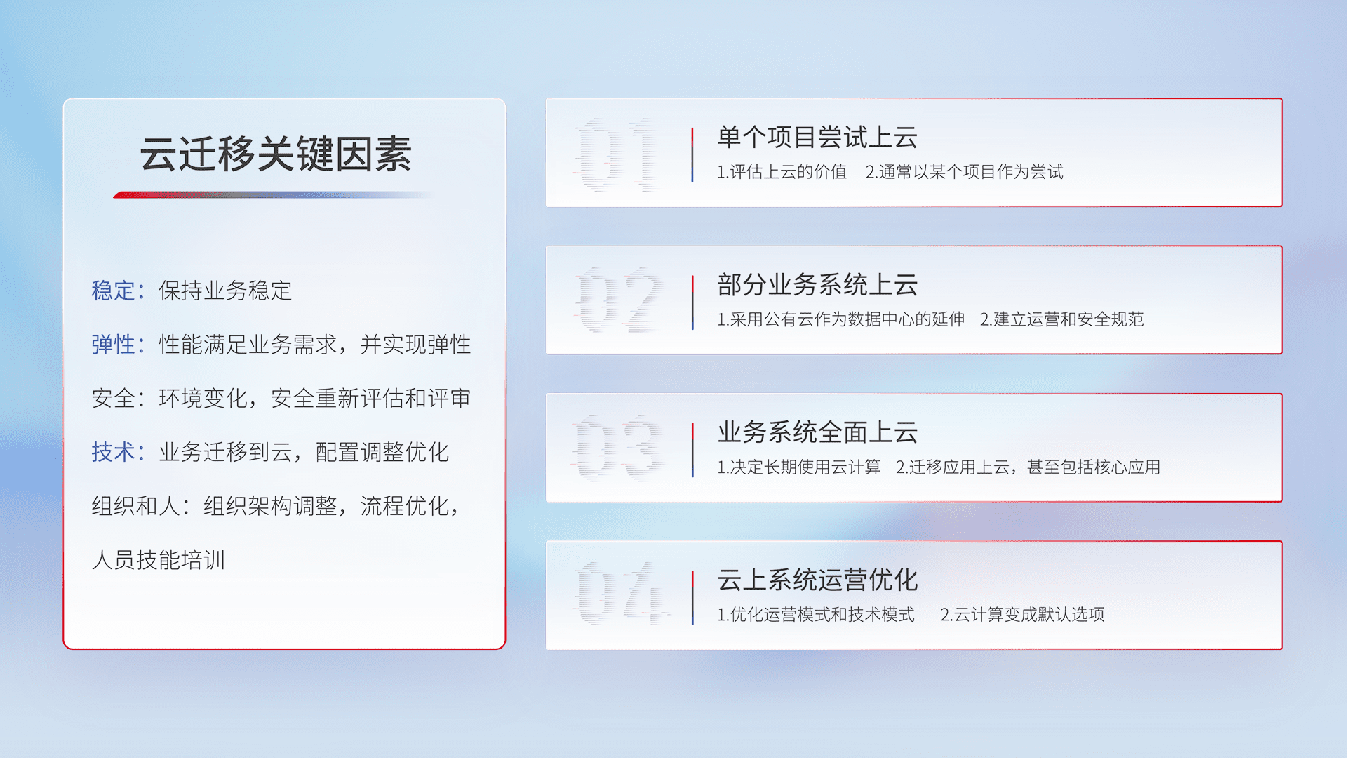 结合实际业务,,从规划设计、、、、云平台选型、、、、云原生改造、、数据迁移、、、集成交付,,,迁移全过程为客户识别最佳上云路径,,,做好风险识别管理,,设计网络架构、、身份权限、、安全审计合规、、、操作审计、、、、日志审计、、、监控告警策略、、、、多站点容灾设计等,,,对云上基础设施进行整体规划,,提升IT治理水平,,,以满足弹性、、、高可用、、高性能的需求。。