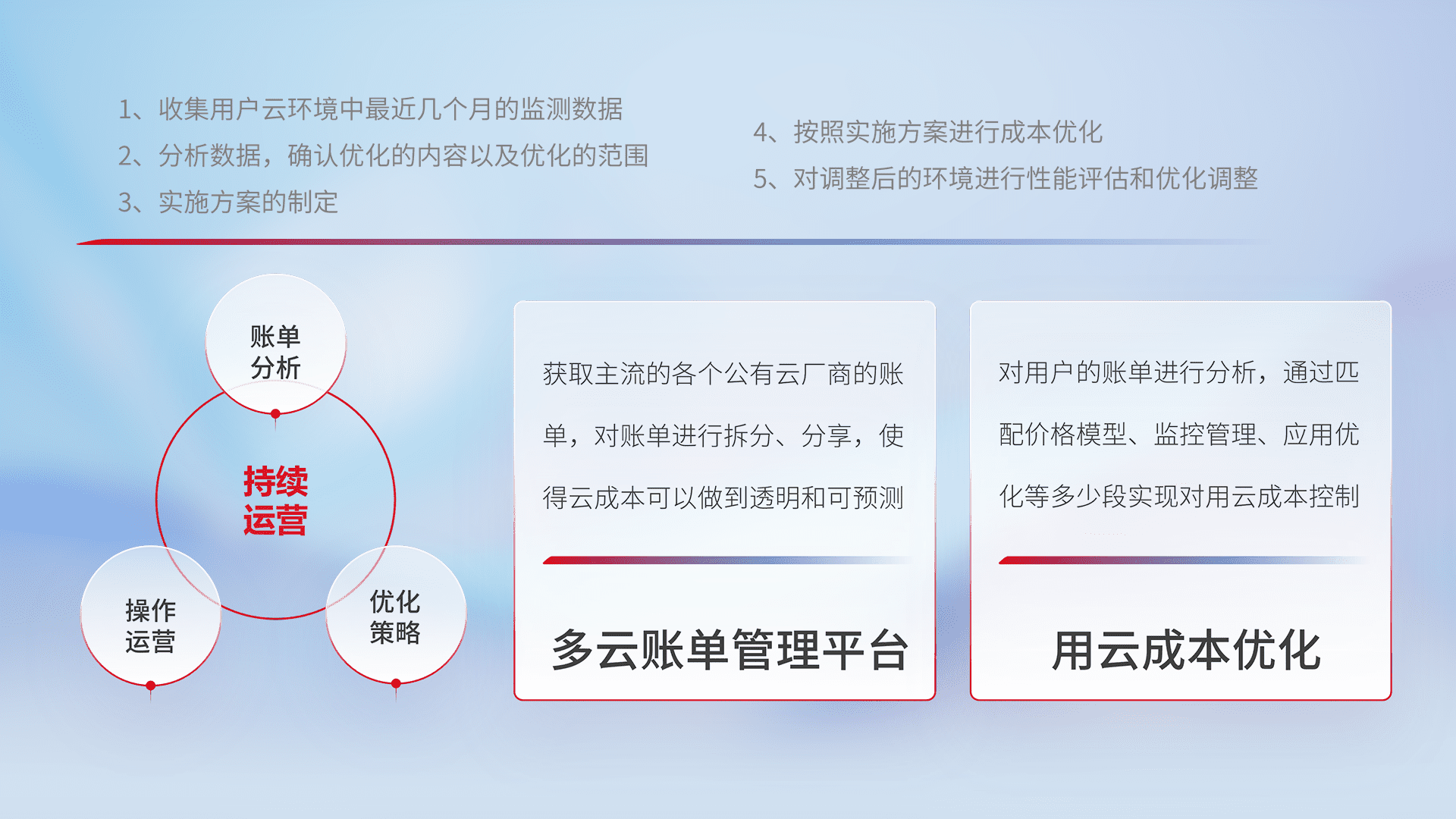 通过多云纳管,,以统一的资源数据模型把客户的云资源进行抽象和封装,,,进而实现对多云资源的统一操作,,,,保障云资源管理的可靠性、、、、稳定性与可用性。。。量身定制化运维内容,,配置、、、开发运维、、、、补丁管理、、、、备份、、、、监控、、认证和访问管理、、、、审计和日常巡检等,,,,保障在用云过程中的可靠度,,,稳定度以及高可用率。。